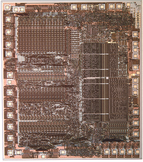T-11 was the last DEC microprocessor to verify the chip layout manually. For several months, I was part of an army of volunteers that crawled over gigantic Mylar plots of the chip with colored pencils and rulers, tracing lines to make sure the wiring was correct, and measuring gates to make sure the sizing was right. Even with only 12,000 placed transistors, it was a tedious and error-prone process.